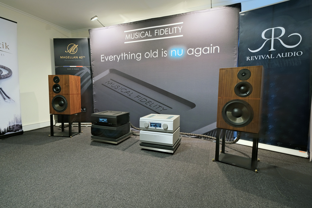 Tim Wallis manned the Audio Marketing room and he personally spun a curated variety of vinyl via the superbly designed Holbo Airbearing Turntable System MkII (review here). Musical Fidelity’s new mammoth Nu-Vista PRE two-box preamplifier and two-box Nu-Vista PAS stereo power amplifier (review here) controlled the wonderfully retro Revival Audio Atalante 5 (review here) all hooked by inakustik cabling. I heard excellent levels of detail across the range, but I was especially taken aback by the sheer sense of presence and nuance on a track with a cello musical underpinning. It was like string rosin was dripping onto my ears directly. Equal beauty and presence were shown to male and female vocals. There was a delectable body and subtle warmth through the mids which I found alluring while the soundfield and image specificity was excellent and highlighted by the most consistently open and realistic image height (for vocalists) I heard at the show.
