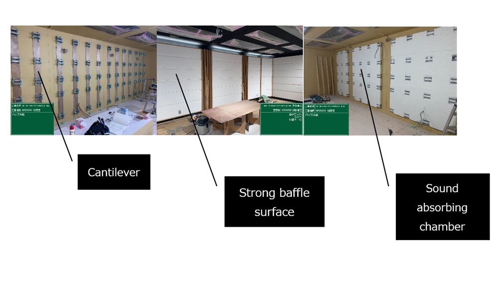 Effectively, this is a room-within-a-room construction. All wall surfaces were structurally strengthened and further reinforced with pillars and steel bracketing. A chamber, or void, was created between the outer and inner walls. Then, the inner walls were lined with the ACP-2 acoustic panelling and Schrader diffusor slats. All wall surfaces and panel mounting structures were separated with expansion joints to further eliminate vibrations. The Schrader diffusors employ a “Dokko hanging system (Japanese hook structure) so it can be freely moved, freely installed, and rigidly fixed.”