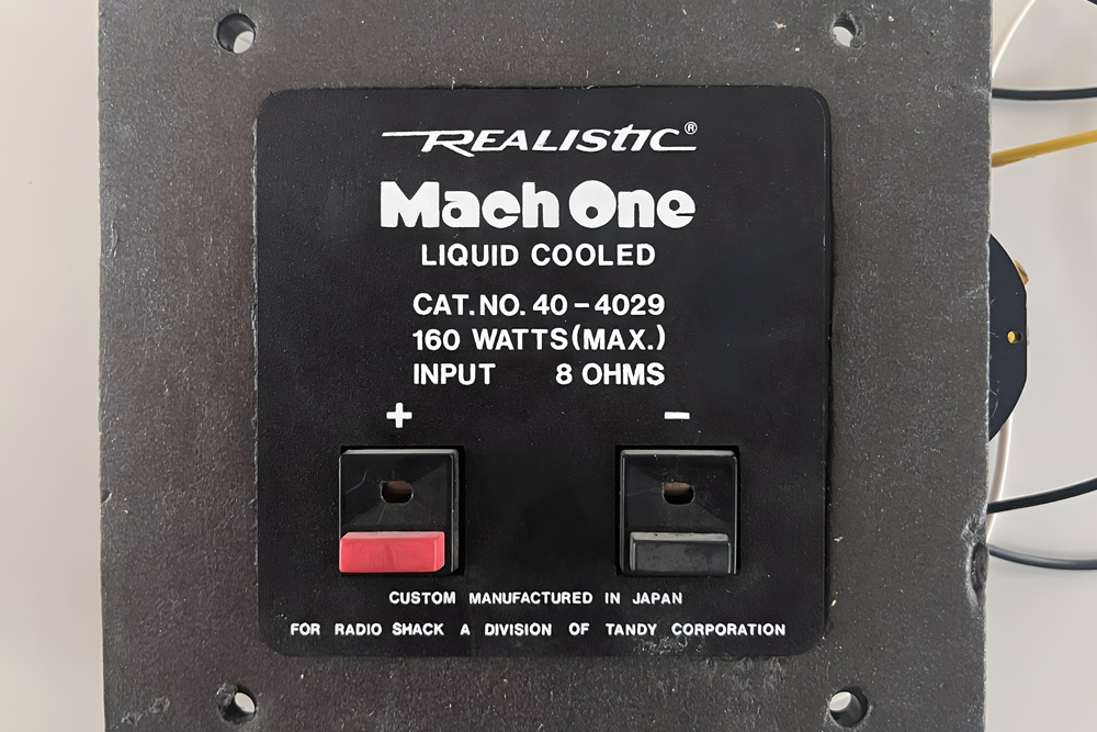 Of course, I’m not claiming that the Mach One is a serious contender in the audiophile realm. Tandy typically used cheap drivers from Japan, rather than expensive drivers from Norwegian or European manufacturers. However, the cabinetry wasn’t too bad. It was particle board with a walnut veneer finish and, in the case of the Mach One, the front baffle was lined with faux leather. There were no binding posts, but rather push button inserts for bare wire.