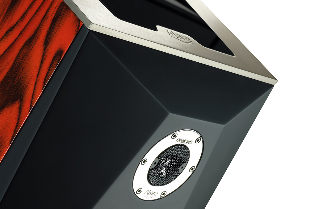 In an unusual bass driver configuration, Alare has employed a custom-designed double driver array of differing sizes. The top-most driver is a 200mm unit while the lower transducer is 250mm, with both diaphragms being constructed from a composite double-layer surface of carbon reinforced paper pulp dampened with a special expanded foam layer. Voice coil construction features Kapton and aluminium. The two drivers are loaded via a specifically-shaped tapered transmission line said to provide not only extended low frequencies but also a more controlled and detailed sound.
