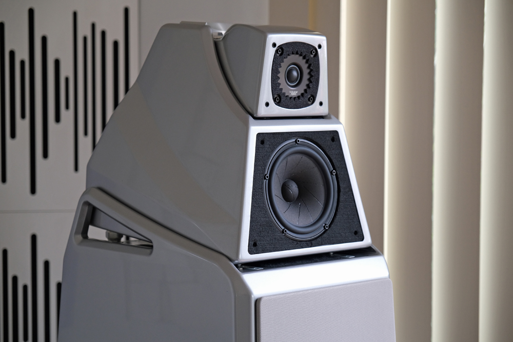 Finally, mention must be made of the overall construction standard and finish quality. Every aspect of the Alexia V’s assembly and every single part of its make-up is of the highest quality. While Alexia V’s aesthetic is subtly different to Alexia Series 2, a keen eye will spot the changes which, in my opinion, make for a more attractive style. There’s a more sculpted, chiselled look to the midrange enclosure’s side panels and some curvy refinements to the tweeter module. The lower cabinet’s top rear is angled outwards and there’s a subtle tilt to the front baffle. I also like the way the top of the bass cabinet sweeps down with a curve at the front in a continuation of the flowing line starting at the side ‘wings’. Paint quality and application is first-rate. In this case, it’s a mirror-like gloss silver with matching light grey grilles (standard grilles are black). To these eyes who have seen just about every audio thing across the globe, Alexia V is a rather striking-looking speaker, in a high-tech industrial design kind-of-way.