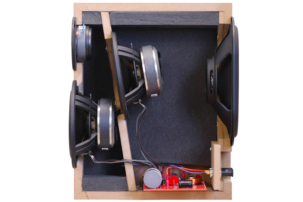 The in-house designed and assembled crossover features a third-order filter design sporting high quality components. Dellichord mounts metal film resistors, polypropylene capacitors and air core and P core inductors and other componentry in a custom fibreglass circuit board. The crossover point is set relatively low at 1.7 kHz.